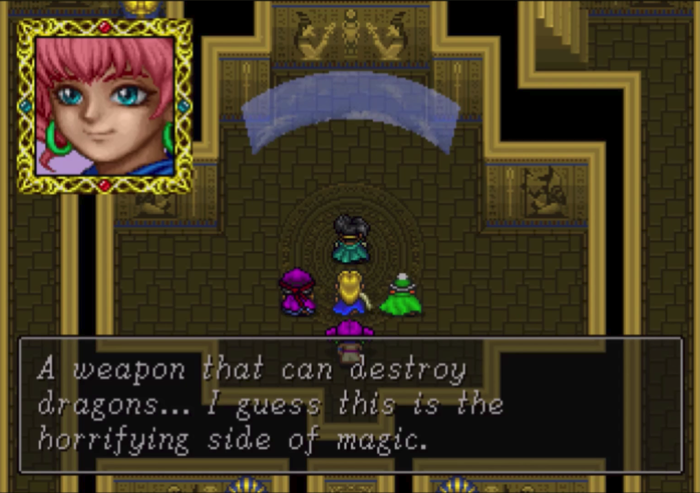 Battle were entertaining as my character sprites were also scaled down in battles if I was under the shrinking effect at the time. After an hour or so of trekking through the mushroom maze and fighting my fair share of random battles featuring some pallet swapped enemies and zombies I stumbled upon a tablet at the bottom of the dungeon. Before approaching I made sure to heal up my party and get ready for a boss battle. In true Beyond the Beyond fashion, there was no boss battle. I was able to retrieve the tablet and use an escape spell to get back to the overworld map. I now had two tablets in my inventory, but still zero idea what I was suppose to be doing with them. On a whim I wanted to see if I could get the table that was hidden behind the throne at Barbaros castle.