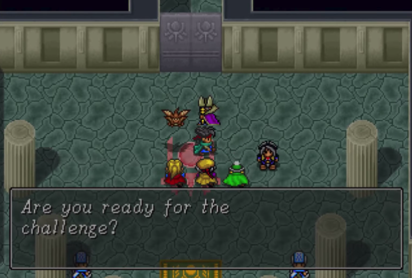 The challenge turned out to be a dungeon containing one of the most frustrating “puzzles” I have ever experienced. The first floor had large, tile-based shapes laid out on the ground. I had to memorize these shapes so I could walk across invisible platforms on the next level. The shapes overlapped and were fairly unique, which made it a well-thought-out puzzle in theory. The problem was that any misstep sent me crashing back to the lower floor, and on the way back up I was almost guaranteed to run into one to three random battles.